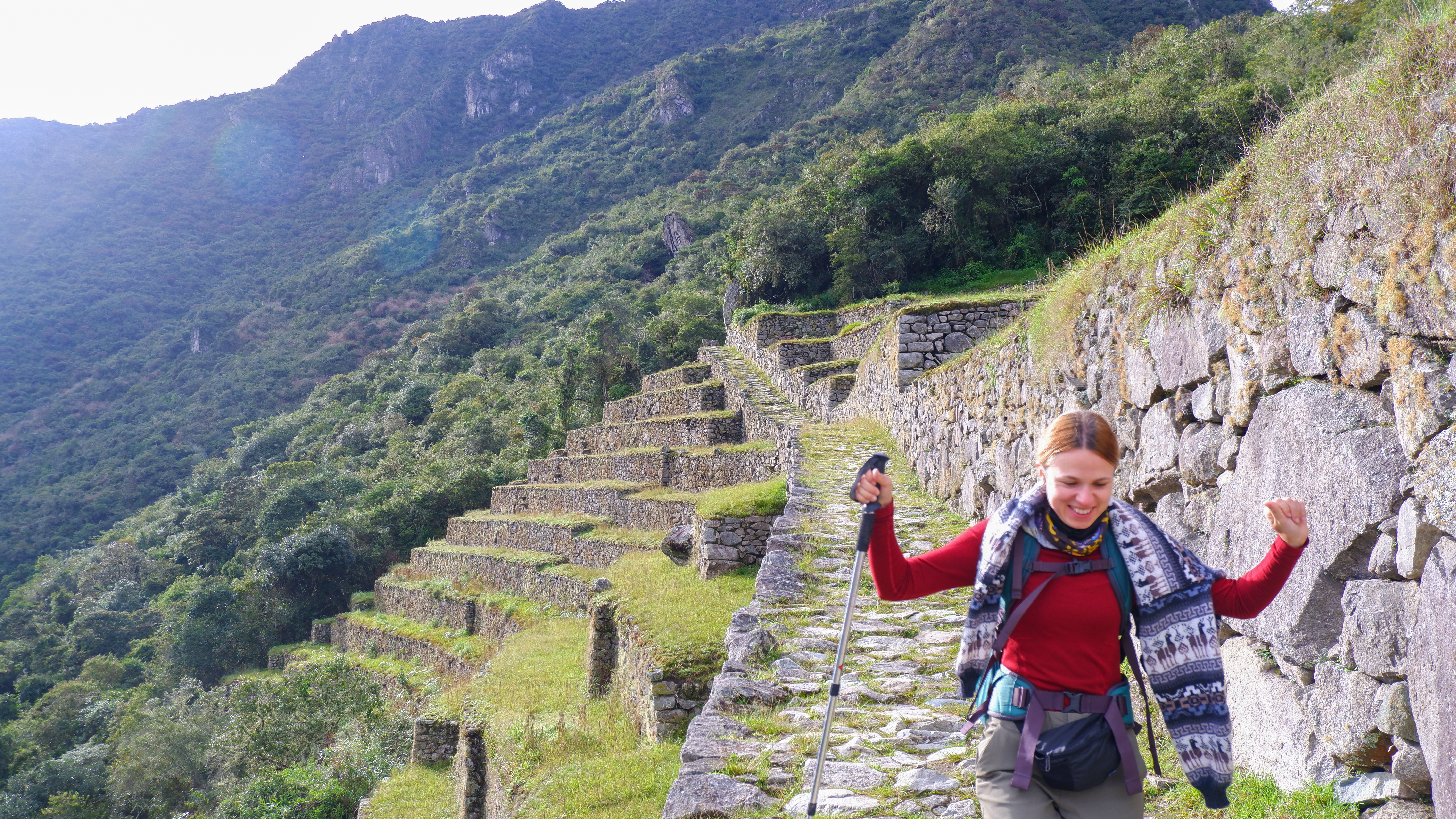 We started our last section of the hike towards Machu Picchu. Our Canadian friend who was the fastest hiker by far doing the whole trail managed to injure himself while posing for a picture. So he took a hiking pole and limped through the last part of the hike.
