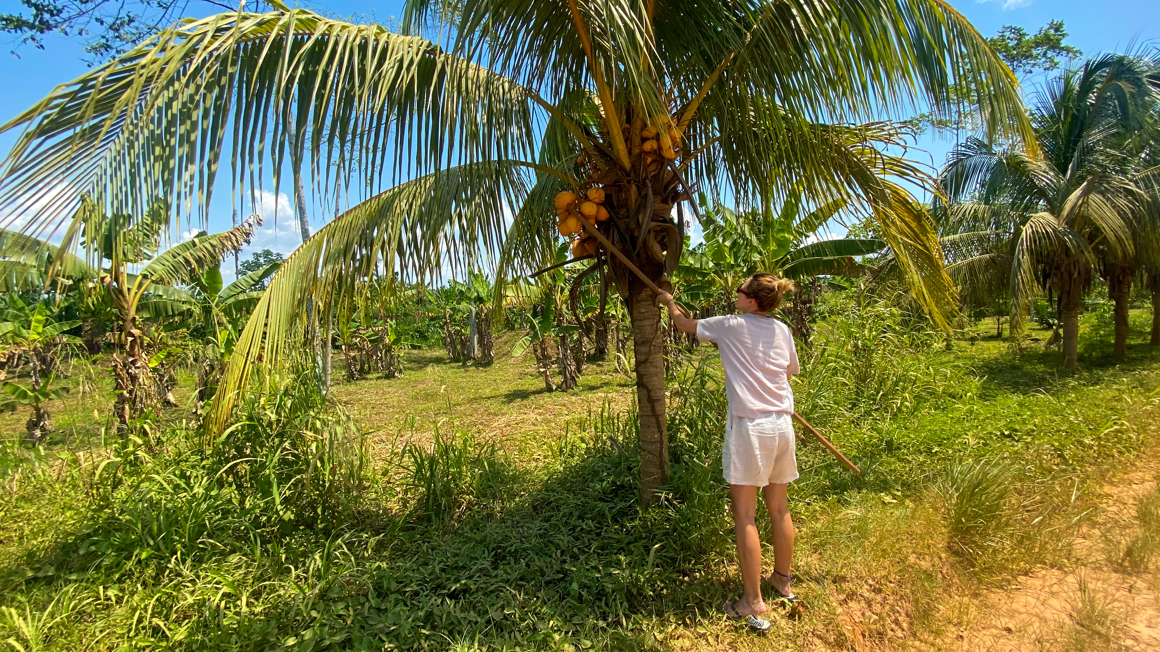 In the afternoon Pio took us with a tuk-tuk to take some cocos. It was the first time for us to both take cocos from the trees as well as try opening it with the machete. For me, it was a frustrating and hard experience. I really felt like a city boy taken to the village as it took me too much time and being completely wet when the coco finally opened 😅.